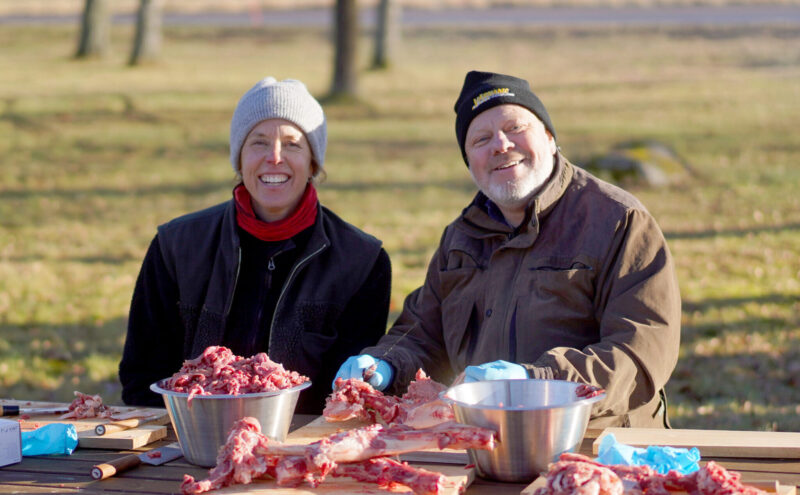 Två deltagare i beredskapsprojektet Rusta bygden skär vildsvinskött. Foto: Chris Olsson